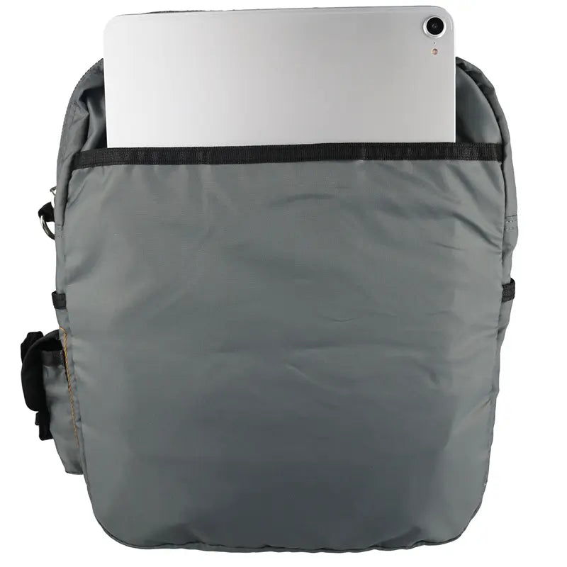 It’s made with water-resistant fabric, fits a tablet/phone neatly in its inner pocket, and even has a side slot for pens—sturdy stitching and a parachute buckle (plus a bright orange rip cord for quick access), make it practical for commutes, outings, or casual carry.