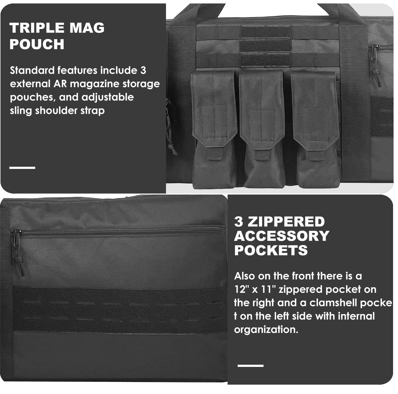 - 【Stylish design】:The front of this gun case has a MOLLE web platform to hold the three included rifle magazine pouches or any other MOLLE pouches or accessories and there's a 3" x 3" loop panel on the MOLLE webbing that you can attach your morale patch or name tape to. Also on the front there is a 12" x 11" zippered pocket on the right and a clamshell pocket on the left side with internal organization